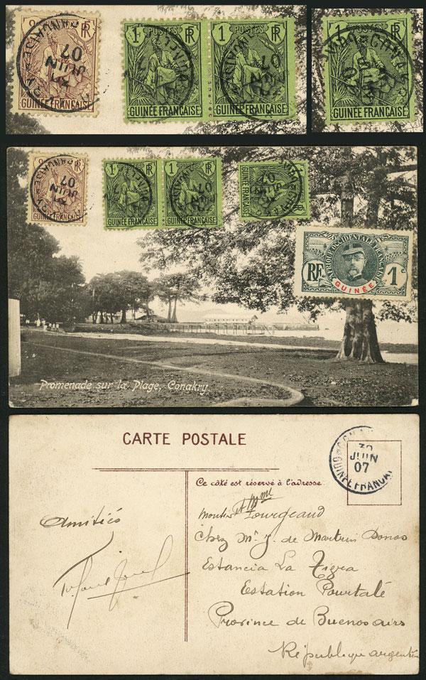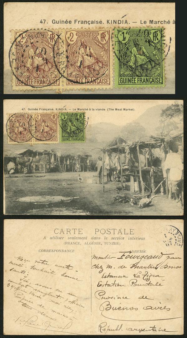 1/AP/1907 Conakry - Argentina, postcard with nice view: "Kindia, meat market", franked with 5c. (Sc.18 + pair Sc.19), unusual destination, very fine quality! (Image)
