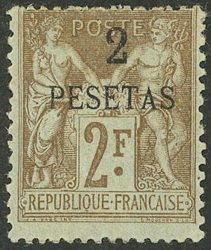 Sc.8, 1900 2 Pesetas on 2Fr., mint with large part of its original gum, very nice! (Image)