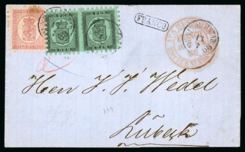 1868 (13 July) Finland Nikolaistad to Lubeck, bearing pair 8 pen green (Facit 6) and 40 pen dull carmine (Facit 9), all stamps tied by small circular Nikolaistad 13.7, small FRANCO struck beside the stamps alongside red circular Aus Russland Franco 26.7, on reverse is Lubeck receiving pm 21 July; a very fine and tidy letter paying the 56 pen rate to Germany, the 40 pen has a minor tooth fault. Cert. Jussi Tuori. (Image)