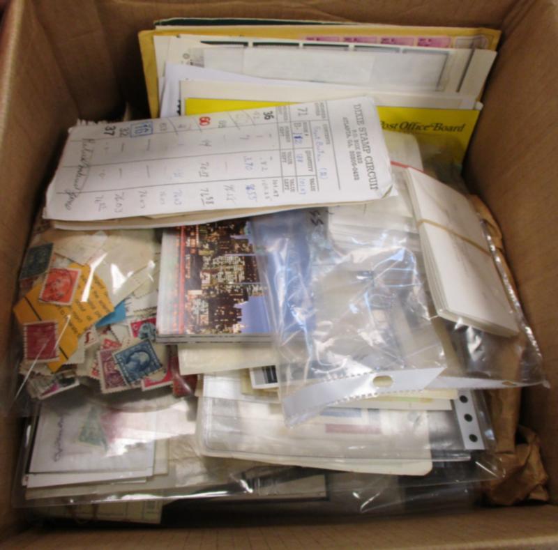 Large Box #4 - General and Country Collections/Accumulations - Large 10 ream paper box holding 48 counter auction folder lots from the 1980's along with a few topical lots. Mostly "Stamp Ade" auction lots processed in the early 1980's. Many folders not catalogued, but those that were totaled $9000 in old value. There is a very musty smell to this lot, and many unused are stuck. Although there is much likely to be mined, patience, nose plugs, or a mask may be required! (Est $200-300) (Image)