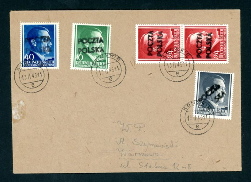 Poland (Konskie) Cover, Hand Overprints, 1945 - Poczta/Polska hand overprints on 4 diff (one pair) General Government Hitler definitives tied by 13/2/45 Konskie CDS sent to Warsaw with receiving cancel on back. Signed by C. Danowski. F-VF with a stain at left. (Est $75-100) (Image)