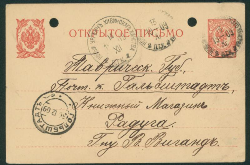 Russia 3c postal card cancelled by datestamp in black 1909-12-13 Kxiva to Pagyra arrival :12/30 cover having holes, Examples of the use of Kxiva Xonligi in Western Turkistan.The rating of the British Russian Overseas Bureau catalog is RRR. (Image1)