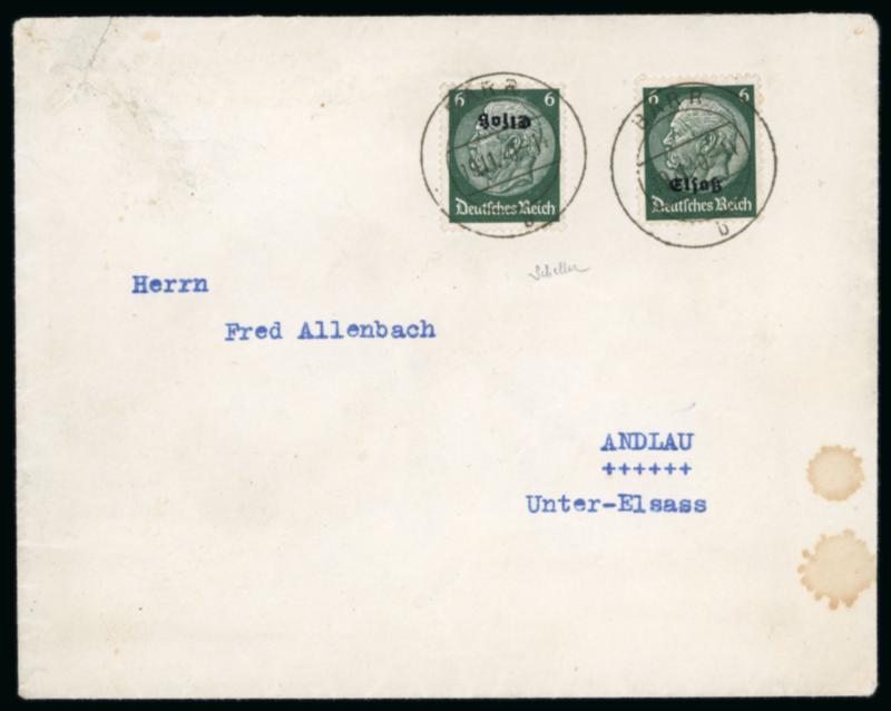 1940, exceptionnelle lettre du 19/11/1940 affranchie avec deux timbres Hindenbourg 6cts vert surchargés dont un timbre avec rarissime variété surcharge renversée Y&T n° 11a, seulement quelques exemplaires connus de cette variété et uniquement deux lettres avec une telle rareté vues à ce jour! Signé Scheller et TB, une pièce maîtresse de la philatélie franco-allemande! (Image)
