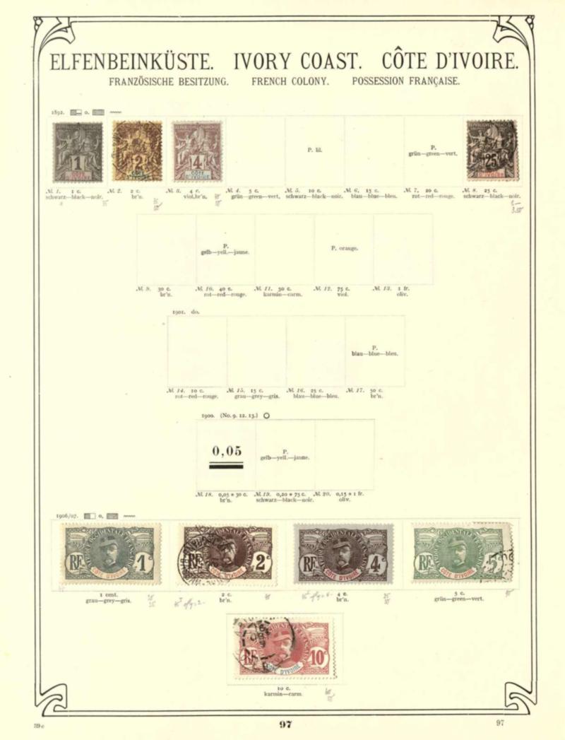 ELFENBEINKÜSTE - 1892/1915, interessante Sammlung auf Albenblättern, dabei ältere Ausgaben, Aufdruckwerte, sowie auch ein schöner Teil Portomarken. (Image)