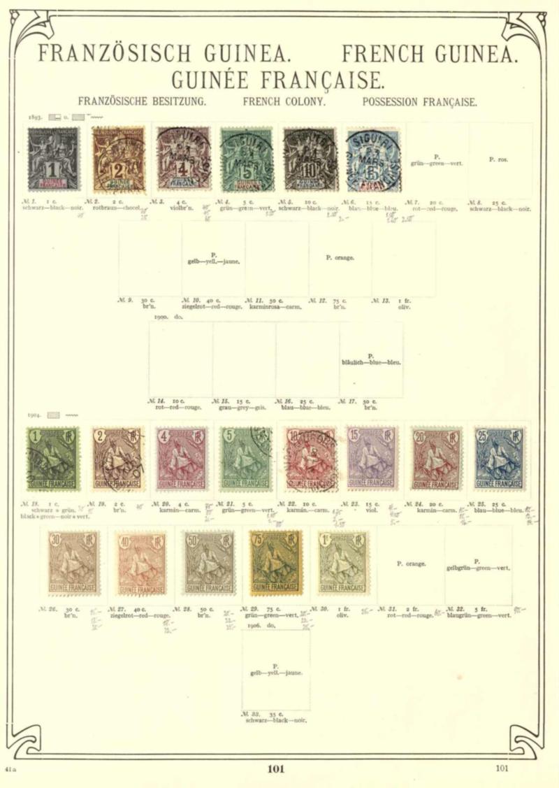 French guinea - 1892/1905, nice collection, wonderful fresh colours on preprinted pages, as well allegory values, postage stamp issues including Michel number 18/30, overprint items, postage due stamps and so on