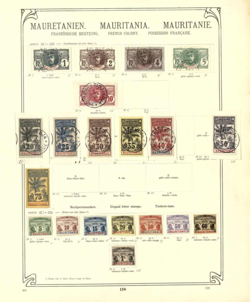 Mauritania - 1906/13, nice collection on Schwaneberger preprinted pages with different postage stamp issues, beautiful letter pieces and postage due stamps.