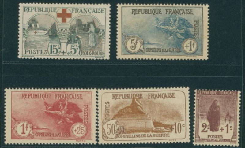 France 1918 15c+5c, 1926-27 2c+1c - 5fr+1fr, , 5 stamps unused hinged, catalog value:45,000YEN (Image1)