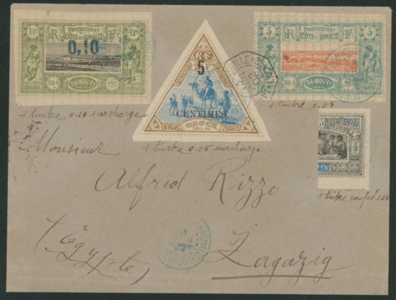 Somali Coast 1894-1902 5c, 0.10c on 1fr, 5c 0n 25fr, Oboc 1894 25c bisect Multi-color franking cancelled by datestamp 1902-06-13 DJIBUTI to Egypt transit :仏船内印→SUEZ arrival :ZAGAZIG catalog value:45,000YEN (Image1)