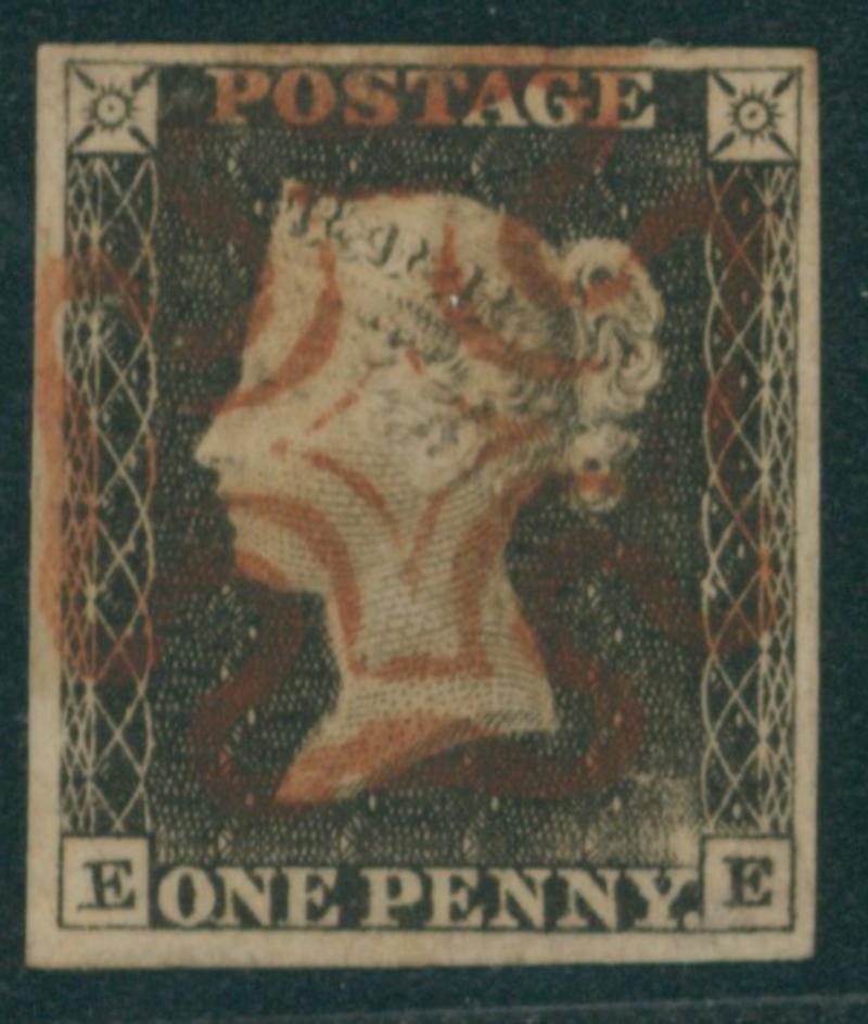 UK 1840 1p EE pl.1a used full margin, cancelled by obliteration in red (Image1)