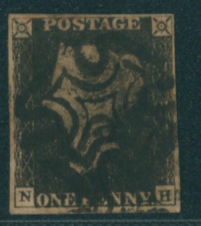 UK 1840 1p NH pl.5 used stained, cancelled by obliteration in black (Image1)