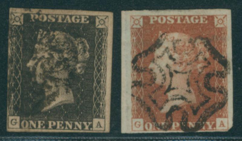 UK Penny black & red, Matched pair pl.10 GA used Vertical crease for the Penny black (Image1)