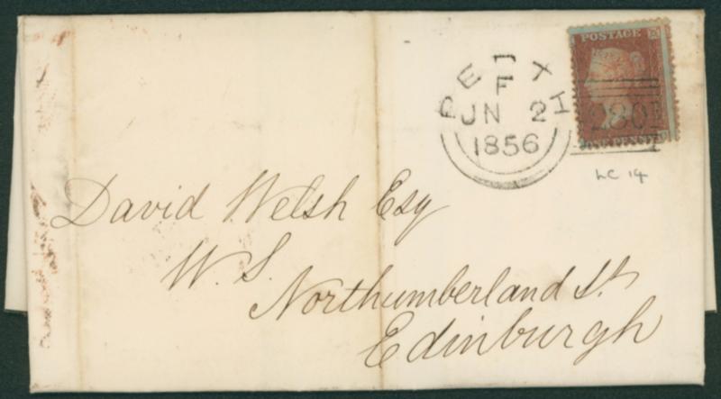 UK 1855 1p single franking cancelled by Duplex 1856-06-02 PERTH to EDINBURGH folded paper, (Image1)
