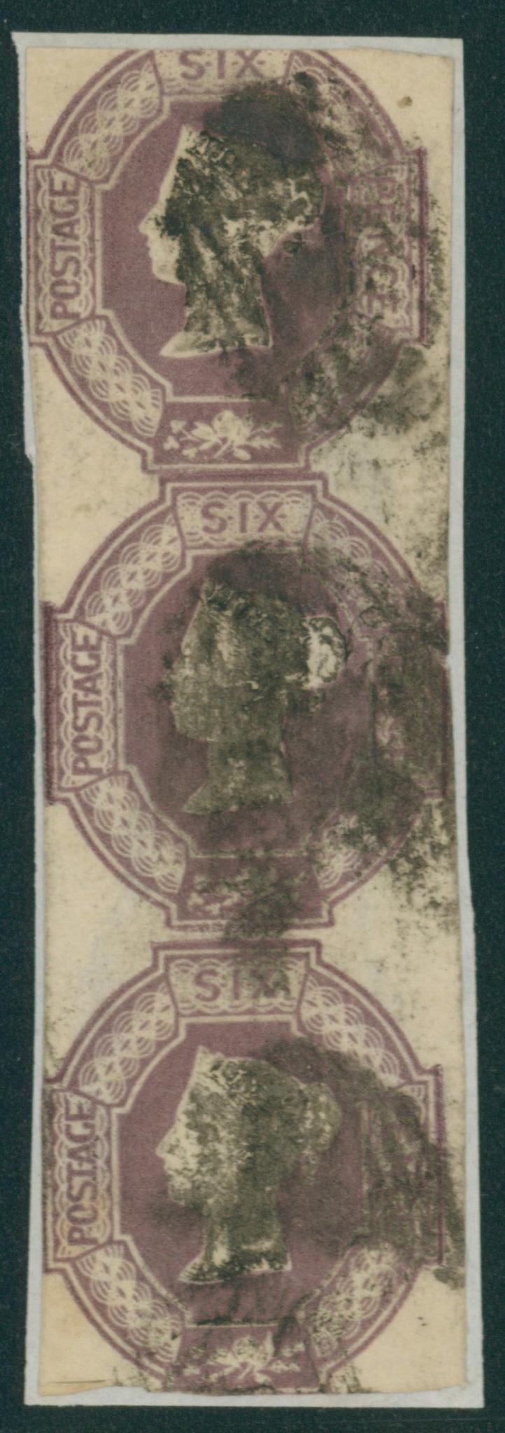 UK 1854 6p vertical strip of three used paper attached, cut into face, unreadable cancellation, (Image1)