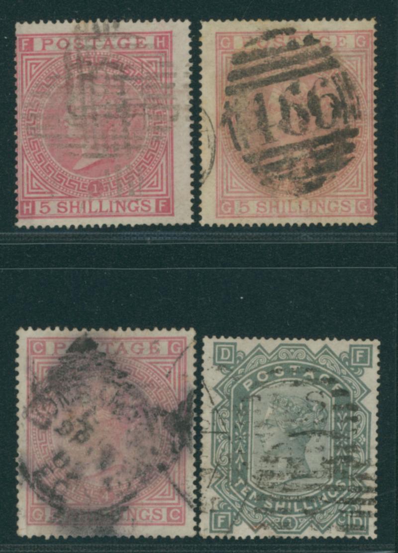 UK , 4 stamps 1867 5sh pl.1,pl.2, 1878 10sh, 1882-83 5sh pl.4, (10sh reperfed.) used catalog value:1,500,000YEN (Image1)