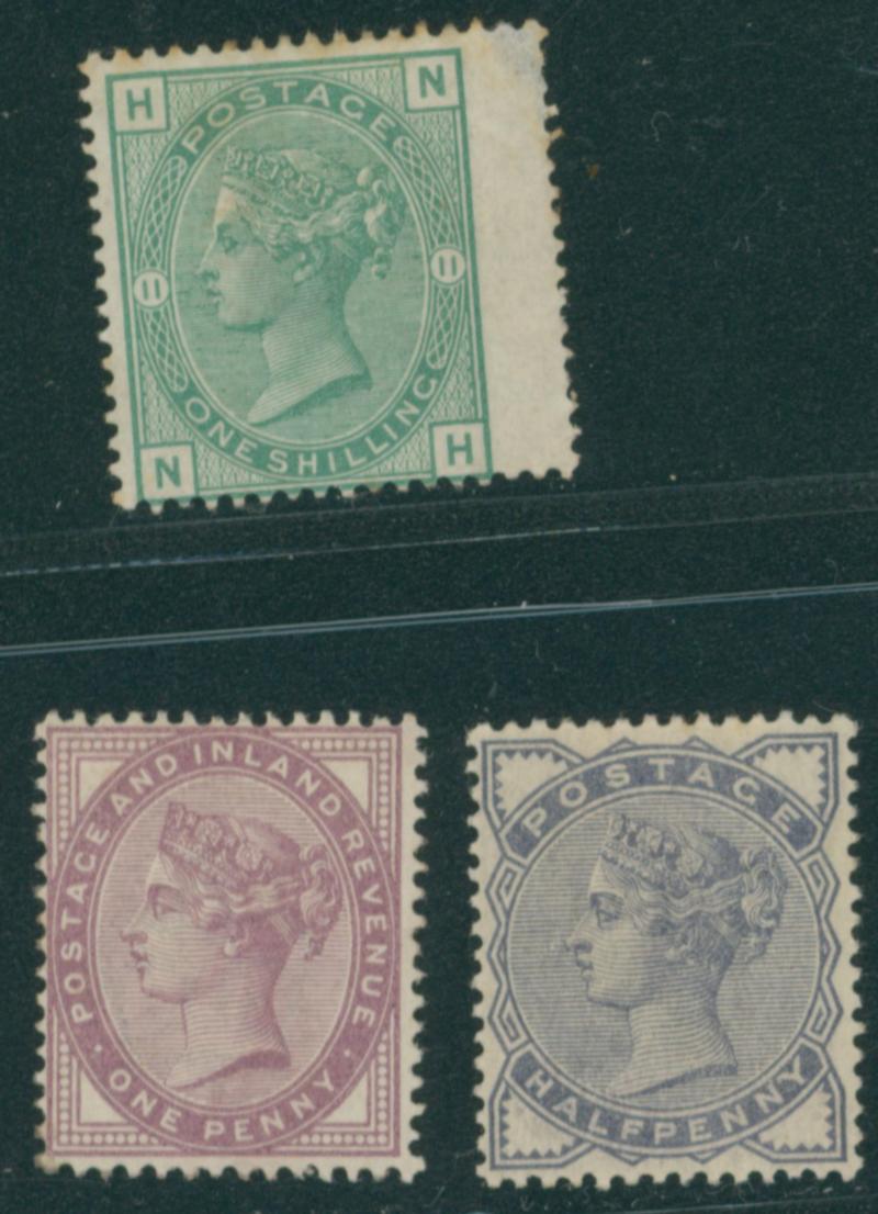 UK 1873-80 1sh pl.11, 1881 1p, 1884 0.5p, , 3 stamps unused stained, 1sh is thin on the back catalog value:110,000YEN (Image1)