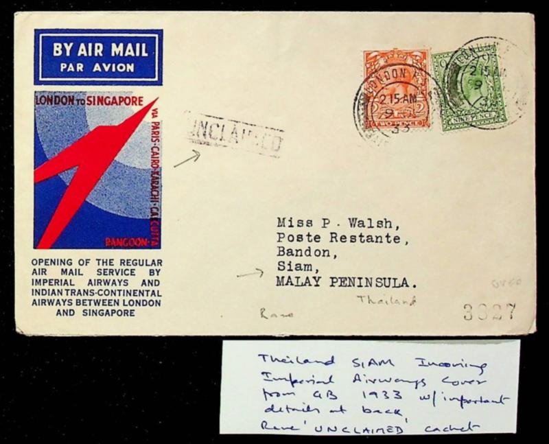 GB 1933 Imperial Airways & India Trans-Continental Airways Airmail FFC from London to Siam Thailand w/ boxed "UNCLAIMED" cachet (Image)