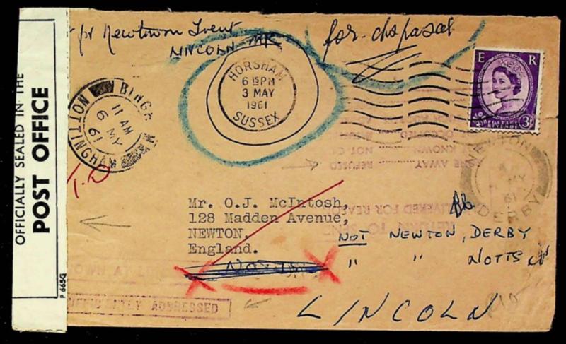 GB 1961 QEII 3d on Officially Sealed cover from Horsham to Newton w/ "UNDELIVERED/ RETURN TO SENDER"/ "INSUFFICIENTLY ADDRESSED" cachets (Image)