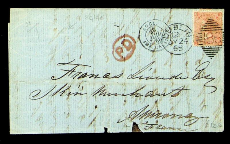 GB Ireland 1868 cover cancelled w/ duplex "186" & "Dublin" cds bearing red oval "PD" to Annonay France (Image)