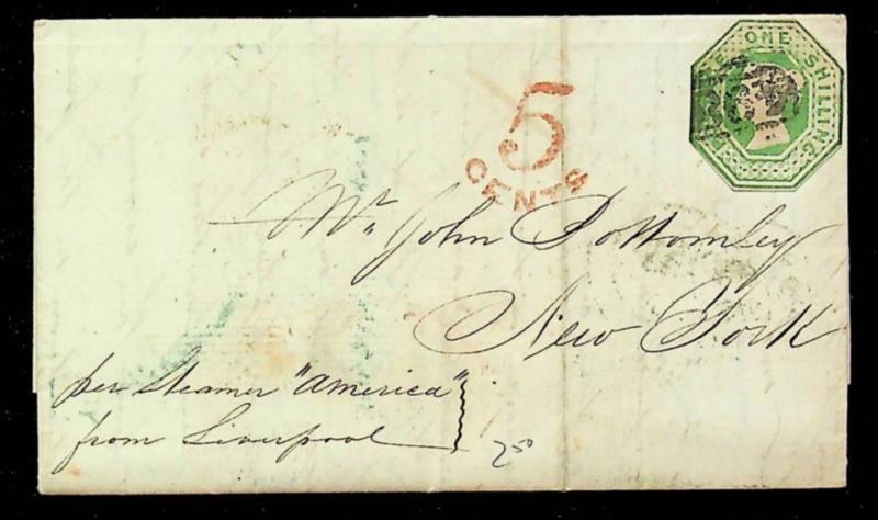 GB Greenfield 1853 QV 1sh Imperf on cover w/ "5c" mark in red per Steamer America via Liverpool to New York USA (Image)