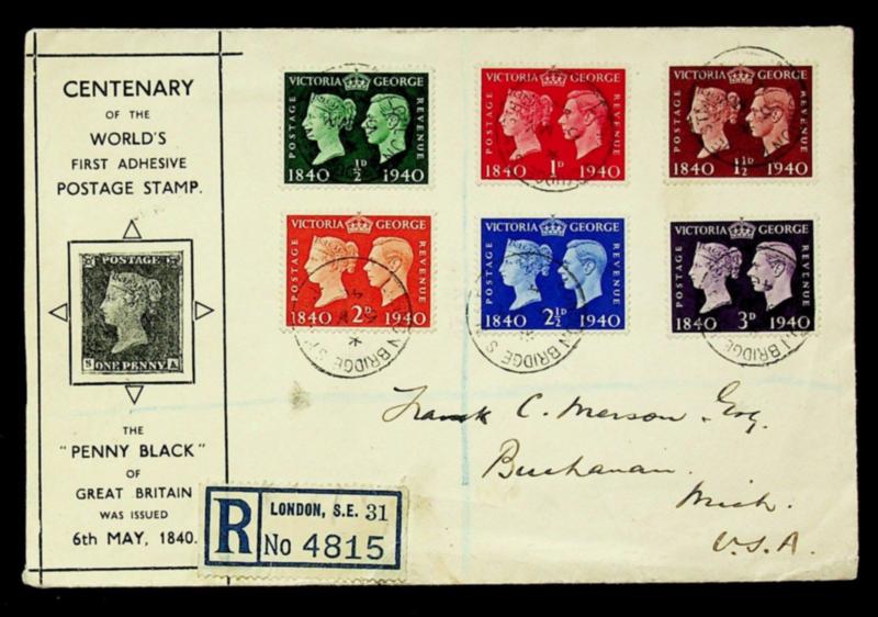GB 1940 QV & KGVI 6v on Penny Black adhesive centenary Regd cover from London to USA (Image)