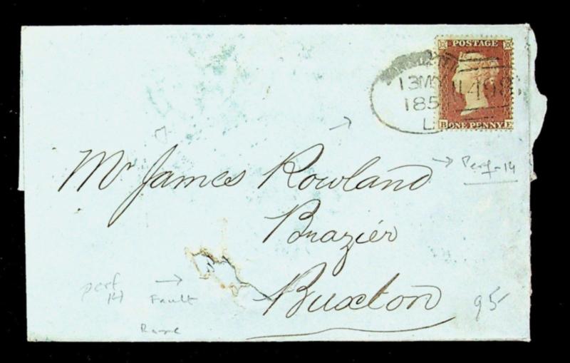 GB 1854 QV Penny Red Perfin on cover to Buxton w. various transit cds at back (Image)