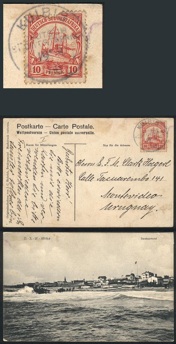 Postcard with view of Swakopmund, franked with 10Pg. stamp (defects) and sent from KUIBIS to URUGUAY on 19/SE/1908, minor defects, very rare destination!