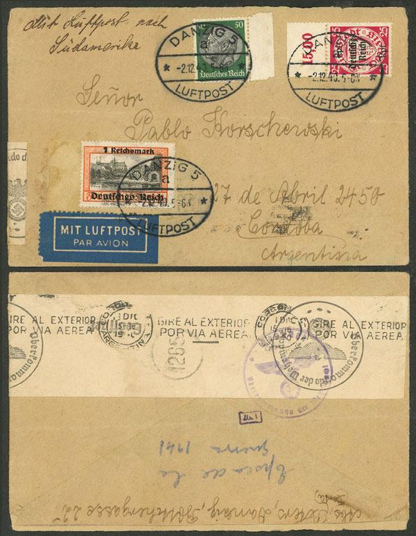2/DE/1940 Danzig to Argentina, airmail cover franked with 1.75Mk. (combining stamps of Danzig and Germany), on back Nazi censor label and Córdoba arrival mark of 9/DE. It is opened on 3 stamps for display, very nice! (Image)