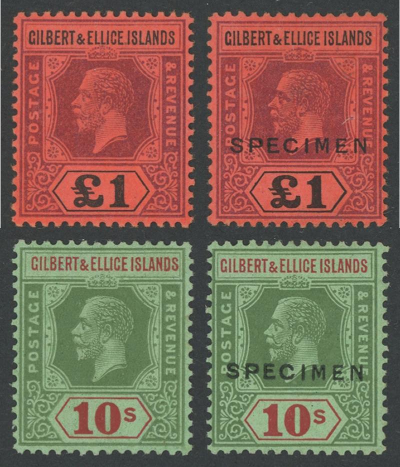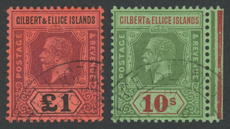 1912-24 KGV Keyplates Multiple Crown CA Watermark £1 purple & black/red SG 24 and 1922-27 KGV Keyplates Multiple Script CA Watermark 10/- green & red/emerald SG 35 marginal with 'Jubilee' lines, both with identifiable part-strikes of the forged '.../GPO/OCEAN ISLD/...' cds cancel, Cat £2000 for genuine postally used. See Gibbons footnotes below SG 7 and below SG 35. (2) (Image1)