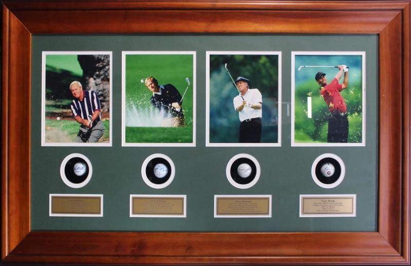 Legends Display comprising golf balls signed by Arnold Palmer, Jack Nicklaus, Greg Norman & Tiger Woods, window mounted with photos of the four legends, framed & glazed, overall 119x73cm. With CoA. (Image1)