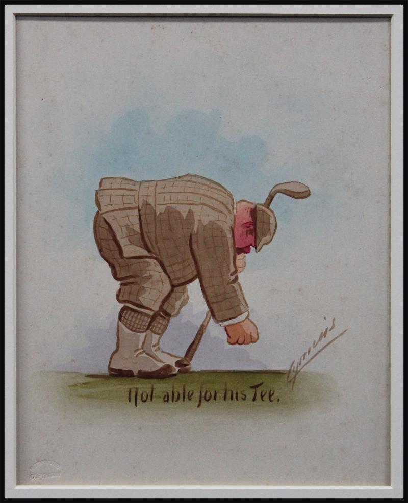 Prints AB Frost plates [12]; watercolour of Bonnie Doon (Sydney) golf course; design for a golf related card; framed AB Frost print; golf related pages from 'The Sketch' (5) & 'The Graphic'; Fairstar menu with Brueghel painting; Jack Nicklaus photograph; also vintage leather golf bag.