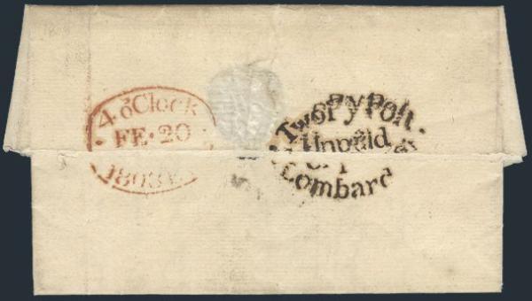Stampless folded London local letter with 2d hammer rate, red oval "4 O'Clock/Fe. 20/1808" & black "Two Py Post/Unpaid/Lombard St" cancels. VF (Image)
