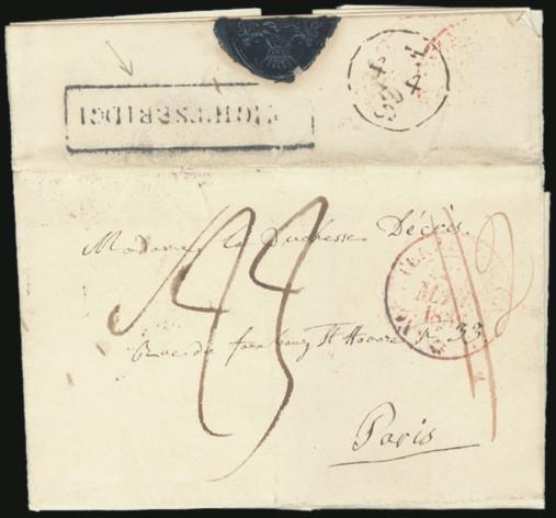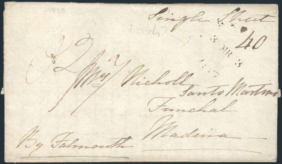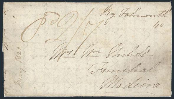 Stampless folded letter dated Cambridge 5 May 1822 to Funchal, Madeira. Has 2Sh7d & 40 Reis m/s rates (no cancels). Lengthy contents from a mother to a daughter partly cross written; nice red wax seal. F-VF (Image)