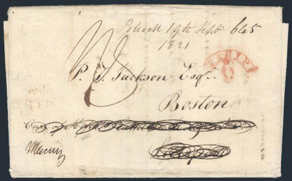 Stampless 1821 Trans-Atlantic letter from Manchester to Boston via Liverpool. Nice variety of cancels & postal markings. Carried aboard the ship "Pollock". F (Image)