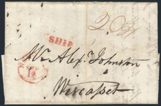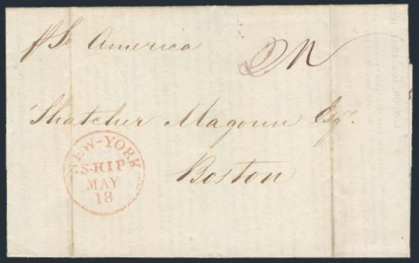Stampless 1837 printed prices current cover carried aboard the ship "South America" from London to Boston via New York. Has nice red New York SHIP datestamp. F-VF (Image)