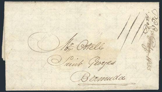 Stampless folded letter dated Devon 31 Dec 1832 to BERMUDA. Has Tiverton 1 Jan 1833 b/s's. Lengthy cross-hatched contents. Nice Trans-Atlantic item. VF (Image)