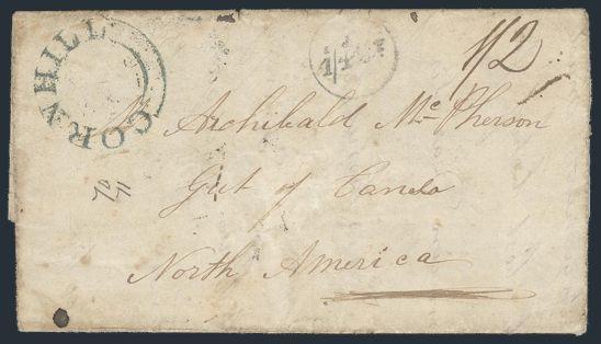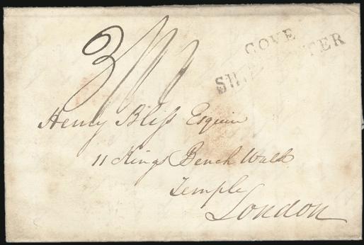 Stampless Trans-Atlantic folded letter from St. John, New Brunswick with black 2-line "COVE / SHIP LETTER" postmark. Has Cove 25 June, Waterford 26 July, & London 28 July 1836 b/s's. F (Image)