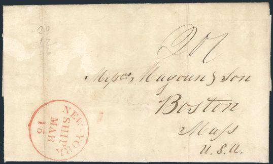 Stampless 1840 Trans-Atlantic cover from Liverpool carried by favour to a Captain Eben Harris to Boston via New York. Has nice NEW YORK SHIP 15 h/s. F (Image)