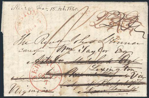 Stampless 1840 Trans-Atlantic letter from Dunoon, Scotland to Lexington, Virginia via Paisley, New York & Boston. Forwarded to Philadelphia thence to Lexington. Nice variety of cancels & postal markings. F+ (Image)