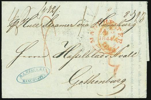 Stampless entire (written in German) with red Manchester 5 Jan 1844 cancel addr to Gothenburg Sweden. On reverse has blue boxed ""HULL SHIP-LETTER C.C. Ja 1844"" and black boxed ""KSNPC/Hamburg/14 Jan '44"" cancels. F (Image)