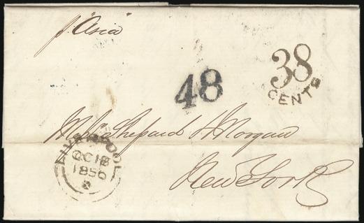 Stampless folded Trans-Atlantic ship letter "per Asia" with Liverpool 18 Oct 1856 cancel to New York. Has "48" and "38 / CENTS" hammer rates. Interesting contents re trade in tallow, potash, wheat, cotton, etc. VF (Image)
