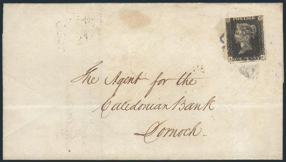 1 (Pl 1a), Tied by M/C cancel on part printed folded dated Aberdeen Town & Country Bank 16 Apr 1841. Addr to Caledonian Bank in Dornoch (rec b/s). A nice early Scottish banking cover. F. Cat $850 (Image)
