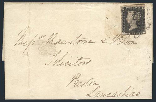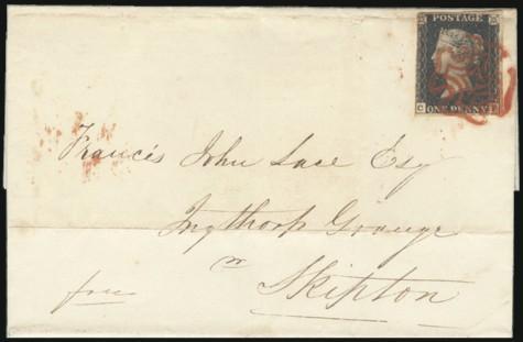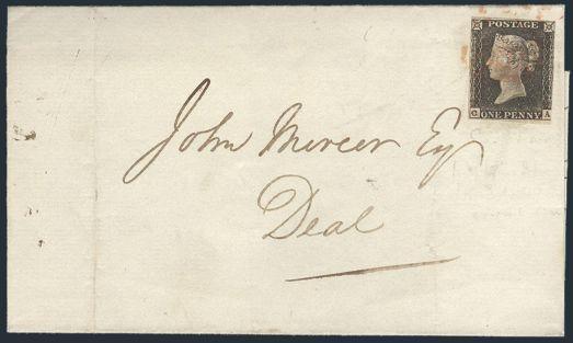 1 (Pl 8), Tied by black M/C cancel on folded letter dated Addington Hall, London 3 Apr 1841 to Preston (same date b/s). VG-F, some age stains on reverse & file fold affects stamp slightly. Cat $850 (Image)