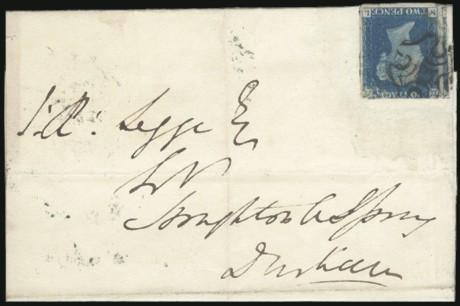 2 (Pl 2), Three margin single. Tied by black MC cancel on partial cover to Dublin with Rushyford & Durham 21 Jan 1842 b/s's. F (Image)