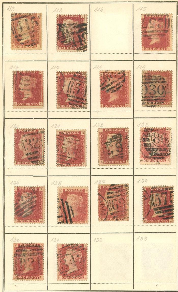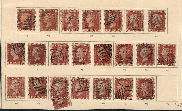 Sc.33, 1864 1p. rose-red, ALMOST COMPLETE set of all the plates (only missing the extremely rare 77 and the last one, 225), mounted on pages of an old album, fine to very fine quality, catalog value US$1,400. (Image)