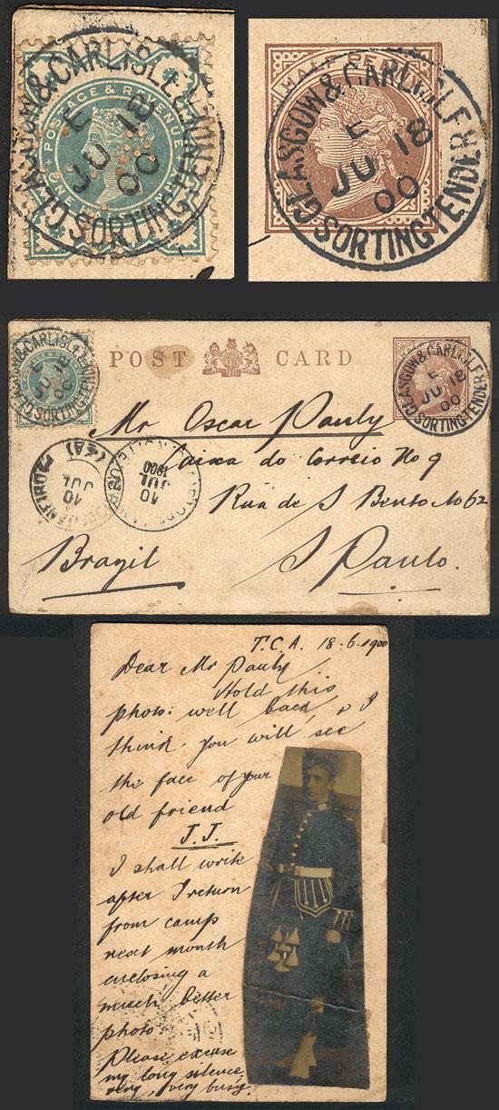 ½p. Postal card uprated with a ½p. stamp with commercial PERFIN, cancelled "GLASGOW & CARLISLE - SORTING TENDER", sent to Sao Paulo on 18/JUN/1900, with photo of a soldier glued on back, VF and interesting! (Image)