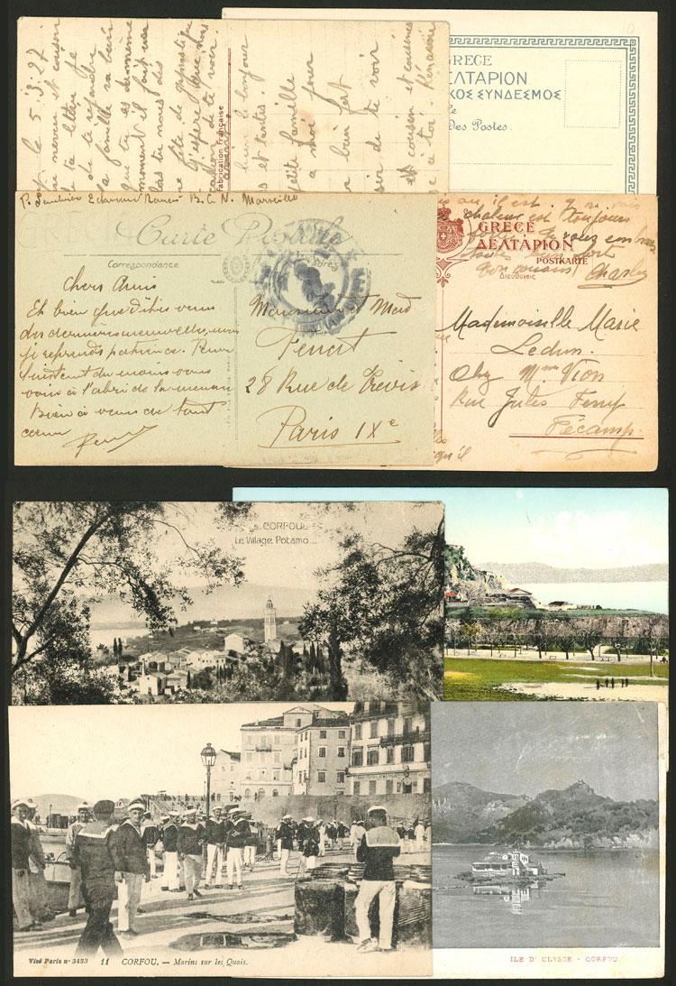 CORFU: 4 Old postcards with nice views, one sent to France with postal franchise, in general of very fine quality! IMPORTANT: Please view ALL the photos of the lot, because all the material has been scanned. (Image)