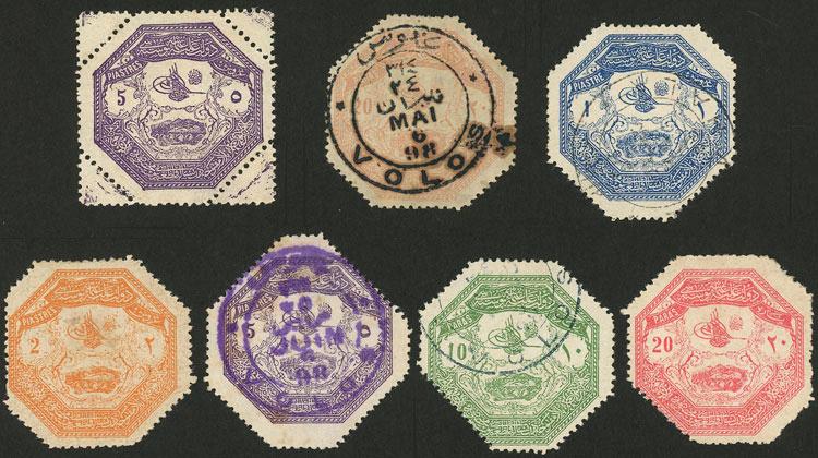 Sc.M1/M5, 1898 stamps issued by the Turkish occupation forces during the Greco-Turkish War, some used with very attractive cancels, one 5pi. (Sc.M5) is MNH, very fine general quality! (Image)