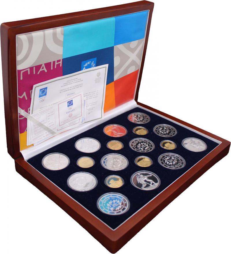 2004 Athens Olympic Games cased gold and silver Proof coin set comprising €100 gold (10g 0.999) x6 designs with Knossos, Krypte, Stadium, Academy, and Acropolis, and €10 silver (34g 0.925) x12 Olympic sports designs, cased with certificates and cardboard outer. (18) (Image1)