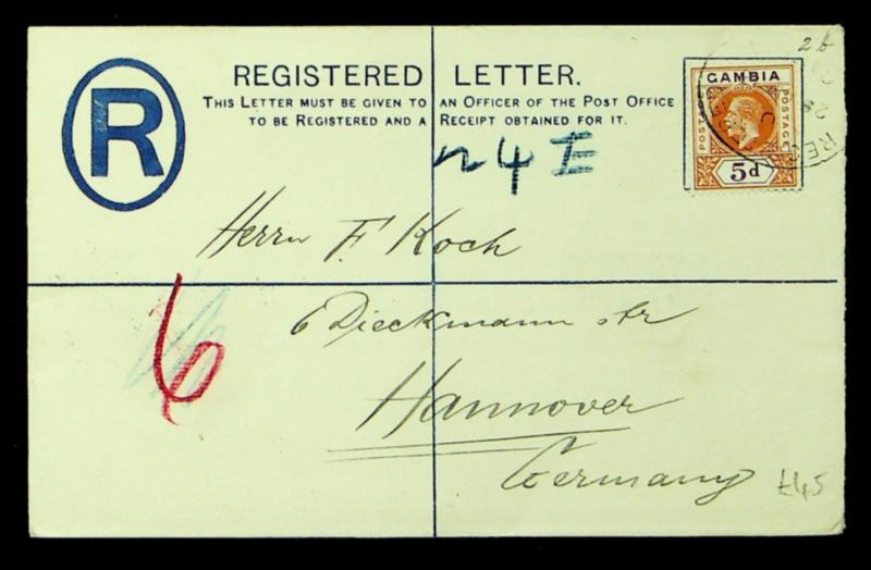 Gambia 1913 KGV 5d uprated on 2d Registered Letter envelope via Liverpool/ London UK to Hannover Germany (Image)