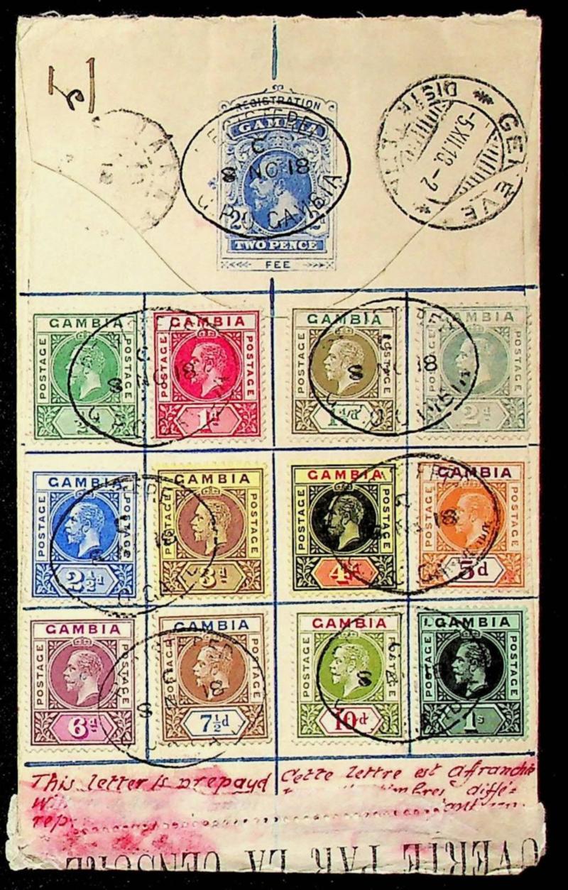 Gambia 1918 WWI KGV 2d Registered Letter env uprated w/ 13v redirected within Geneva Switzerland (Image)